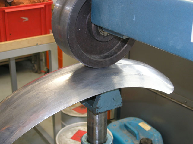 Työ aloitetaan siten, että peltiä kuljetetaan edestakaisin kevyesti kiristettyjen rullien välissä. Tässä on 1,5 mm alumiinilevy taipumassa rapakaareksi.