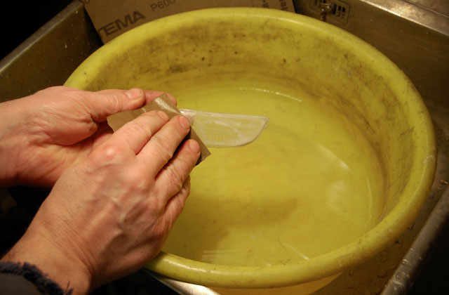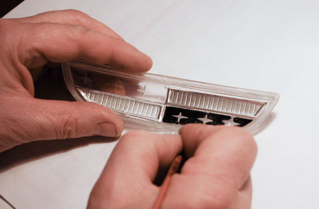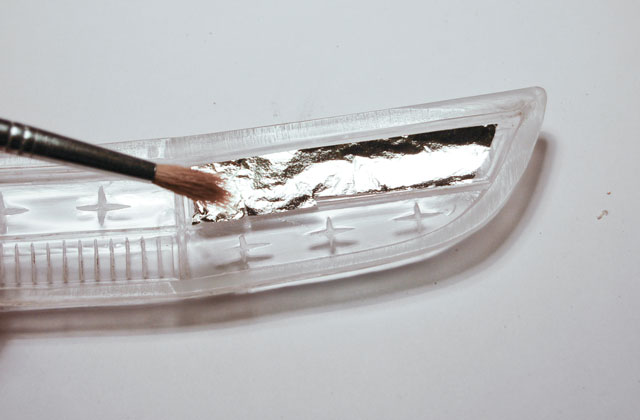 Kiinnitteeksi hopealle käy tinnerillä ohennettu valumuovi, jota sivellään niihin kohtiin, mihin hopean halutaan tarttuvan.