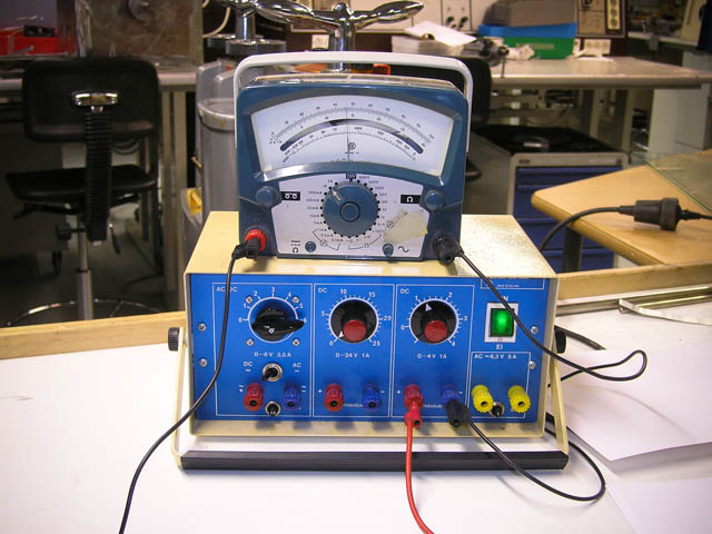 Virtalähteenä voi toimia tällainen yleisvirtalähde, jonka kaveriksi on kytketty vanha yleismittari.