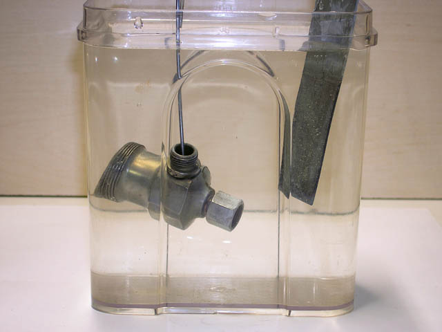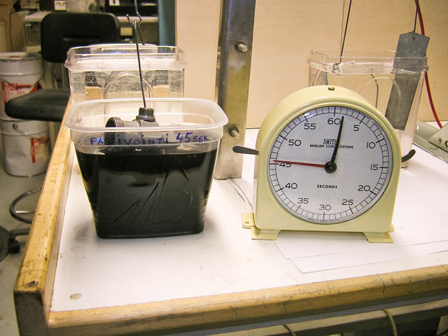 Tässä sinkitystapahtuma on käynnissä. Huomaa anodia lähinnä olevan pinnan kevyt "kuohuminen".